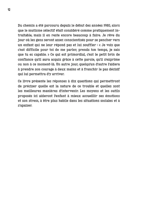 Peu connu et peu diagnostiqué, le mutisme sélectif est caractérisé par l’incapacité régulière d’une personne à parler dans des situations sociales spécifiques. Comme il peut interférer avec la réussite scolaire et avec la communication sociale, il est essentiel d’intervenir rapidement afin d’aider l’enfant à le surmonter. Or, les parents et les intervenants sont souvent bien peu outillés pour reconnaître les enfants mutiques ou pour intervenir avec les bons outils.